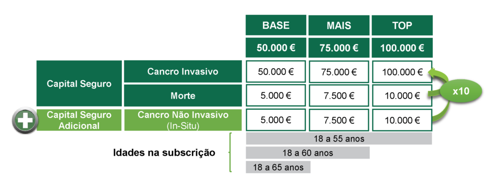 • Produto com proteção em caso de cancro invasivo 10 vezes superior à de caso de morte;